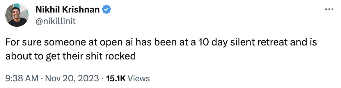 The same is undoubtedly true for the staff at OpenAI, who watched their CEO and president get whacked; an interim CEO promoted and then demoted; another interim CEO hired and met with “f— you” emojis on Slack; and a board of directors whittled from six members to four to three (including Larry Summers!)—all over the course of 120 unhinged hours. If you somehow missed all the madness (see one exemplary tweet at bottom), Paris and Julia brilliantly recapped the whole exhausting saga in this week’s cover story.